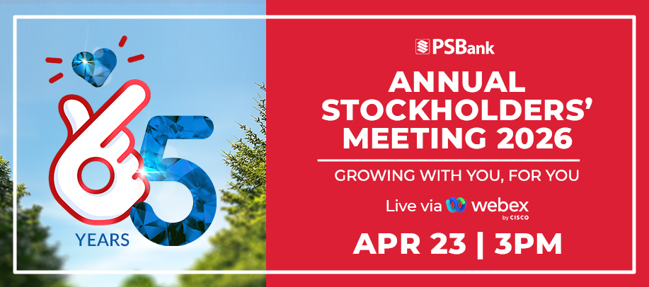 Access to the PSBank Annual Stockholders' Meeting will be on the actual date of the event – April 24, 2025 | 3:00 PM. We will however make available entry to the webinar as early as 2:00 PM.