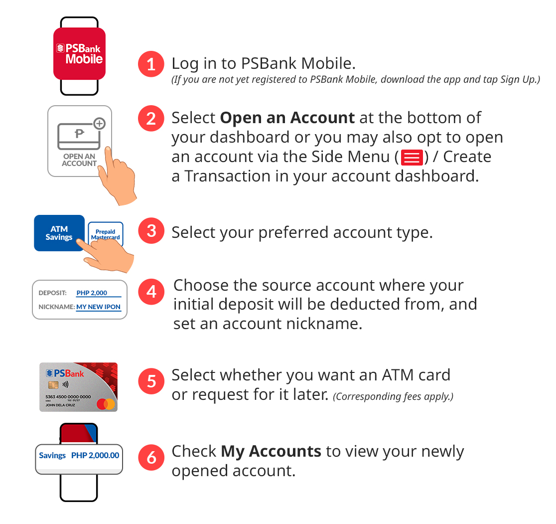 If you are already signed up in PSBank Mobile, simply log in, select Open an Account at the bottom of the dashboard or via the side menu, and provide the required information.