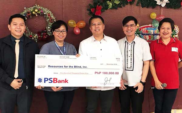 STRONG SUPPORT. Resources for the Blind’s Executive Director Amy Mojica and Resource Development Head Lorinda Ang warmly receives the annual donation from PSBank, turned-over by Senior Vice President and Information Technology Group Head Neil Estrellado, accompanied by People Communications and Events Head Dylan De Mesa, and Corporate Communications Head Marco Sindiong.